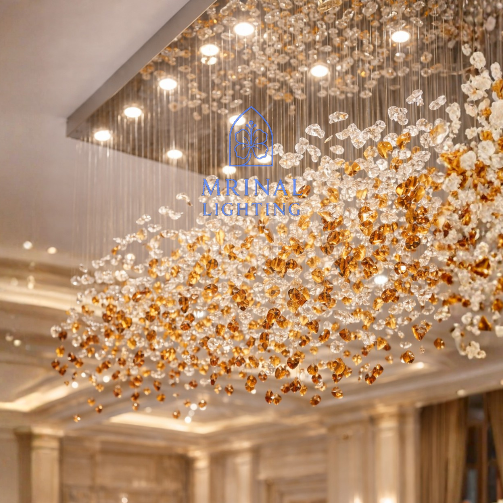 The Luxury Stone Lighting Chandelier is made for spaces where simple lighting does not feel enough. It has a strong stone inspired look that gives the chandelier a solid and premium feel. The crystal pieces reflect light softly and create a calm, rich atmosphere. This design works very well in banquet halls, hotel lobbies and large ceiling areas. It looks elegant without being too loud or over shiny.