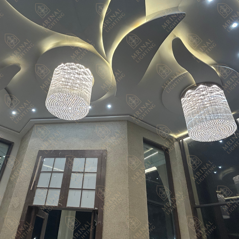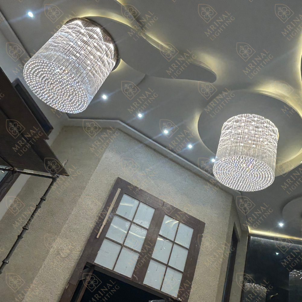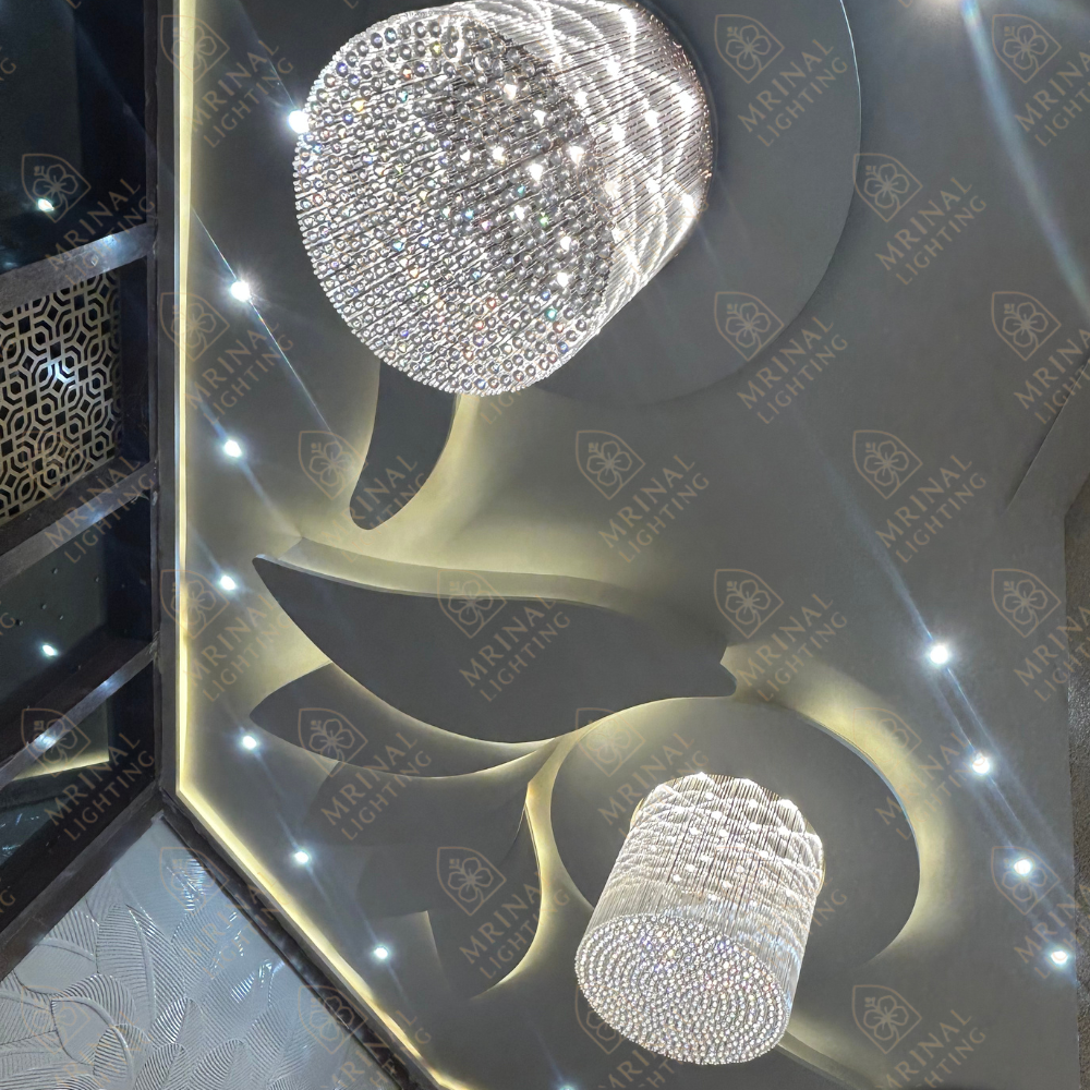 This chandelier is designed for banquet halls, hotel lobbies, villas and duplex homes where you want modern yet grand atmosphere. Its flat ceiling design make it safe and stylish, while the crystal lines add richness without being heavy. Light spread evenly across ceiling giving perfect soft brightness that make space look bigger and elegant.